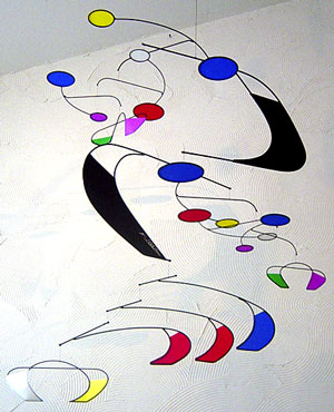 The Aurora Mobile hanging mobile designed by Joel Hotchkiss, utilizes the characteristics of both cross-viewing and under-viewing mobiles. We have added a 3rd upper section to the mobile to add size and diversity to the movement of the design. A nice solution for stairwells and open ceiling spaces. Welded steel-rod framing painted black and colorful Dacron fabrics create a balance system of color and form. All the shapes move independently to keep the eye continually engaged.