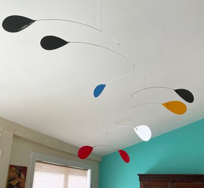 The retro modern "Breeze" mobile is made with colored vinyl shapes that are riveted to aluminum armatures. Packed pre-balanced, ready to hang up. Approximately 30"H X 36"W. Signed and dated by Joel Hotchkiss. Also available in Black and White.