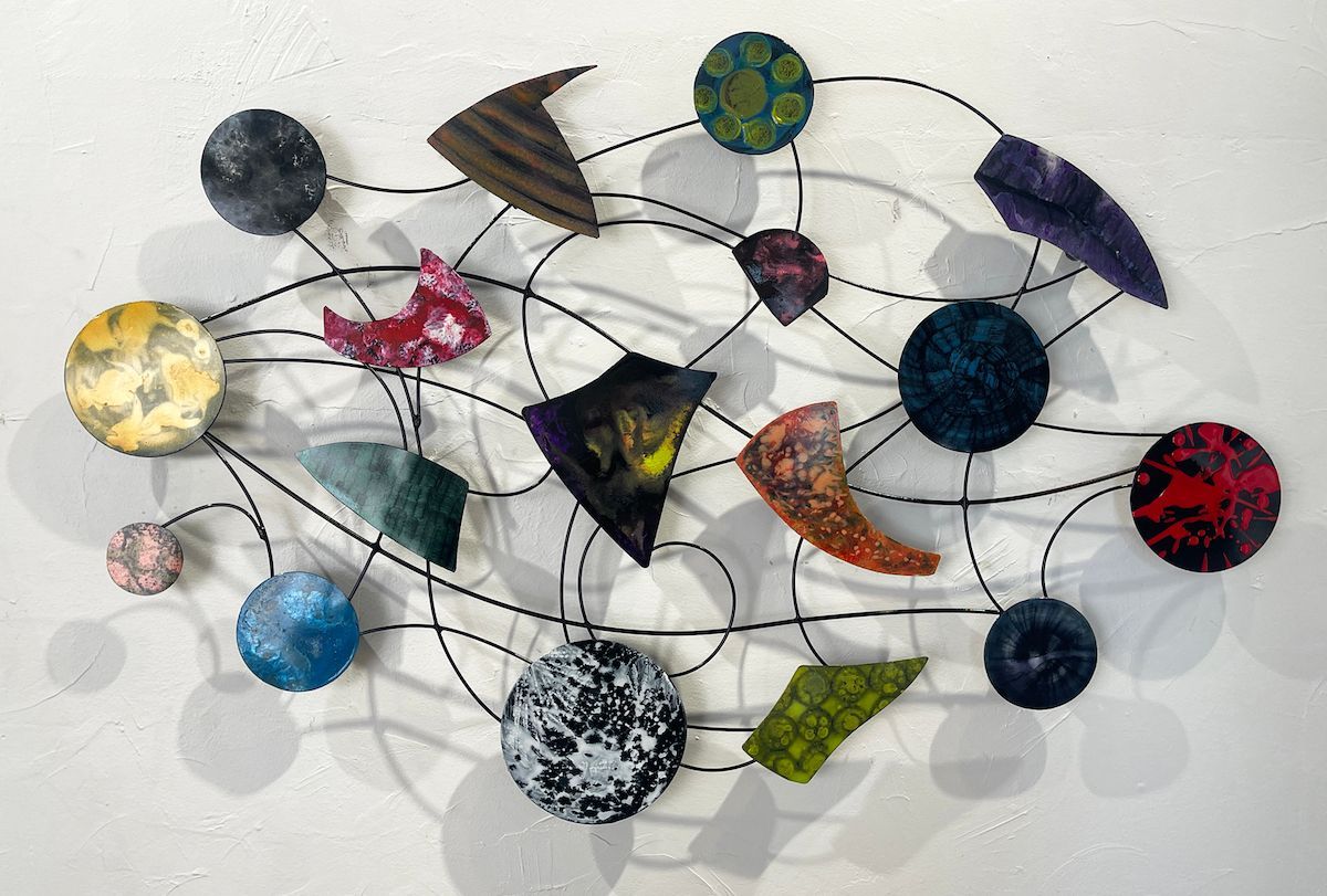 "ETHEREAL by Joel Hotchkiss. Hand painted on Copper with black Steel armatures. Dimensions: 31"W X 20"H. The clear-coated finish makes the colors appear as enameled glass. Hangs away from wall 1 1/4" Signed and dated by Joel Hotchkiss