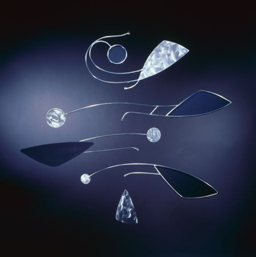 Similar in gesture to the Spanish dance form, the Flamenco Copper mobile relays a style and beauty all its own. With a visual sense of sophistication, the brightly brushed copper contrasts with the black steel armatures and flat black canvas vanes. A dramatic presence that will complement the fine decor of contemporary or traditional homes. The copper is clear-coated to preserve the finish. The mobile is carefully hand packaged, signed and dated by the artist Joel Hotchkiss and is fully assembled, ready to hang upon arrival. 38"H x 38"W. For interiors only. ALSO Available in the Aluminum and Black Flamenco Shown Below... This can be selected umder OPTIONS.