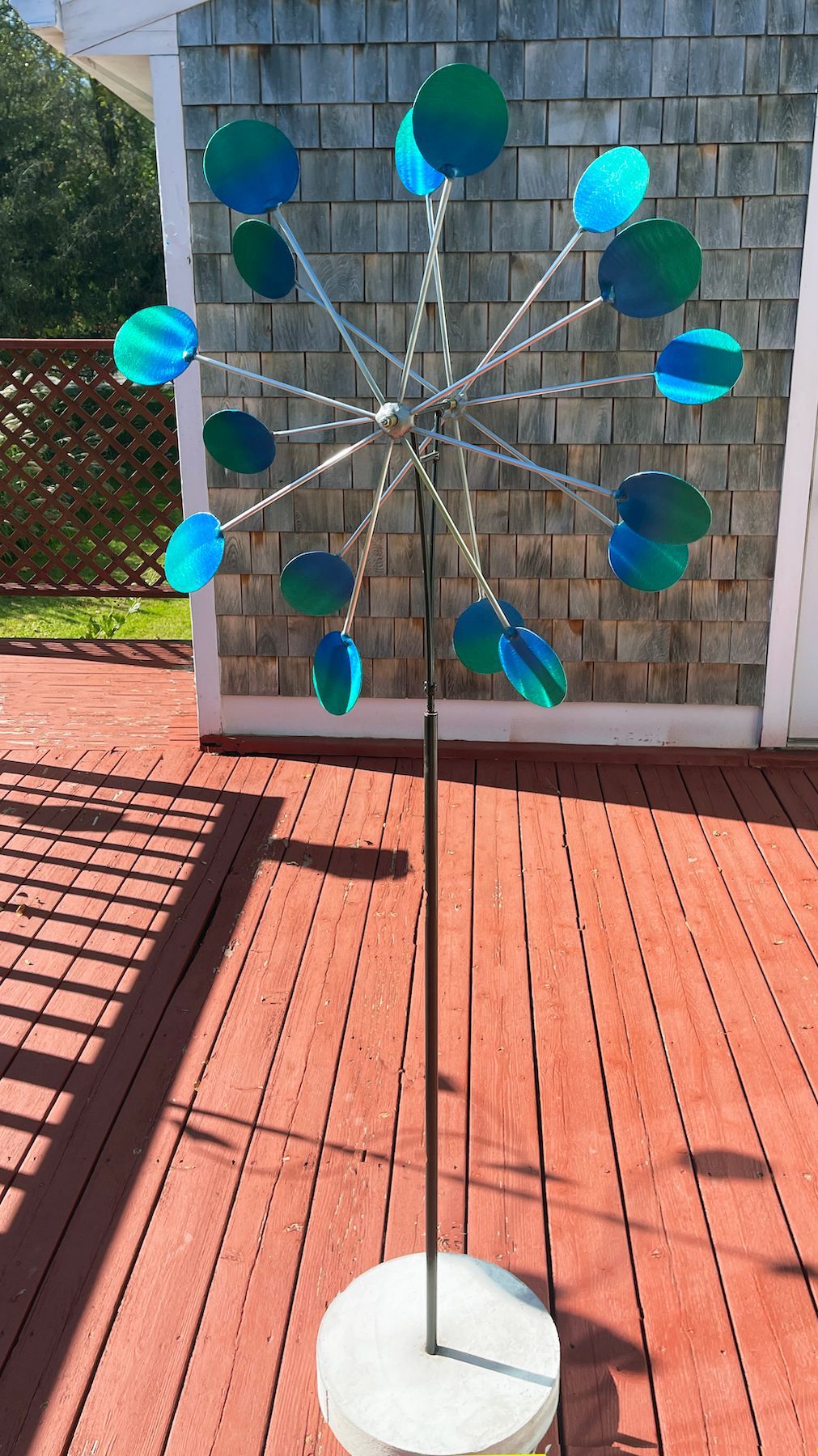 GRAND 30" Garden Wheel with Blue/Green Circles. Includes a 16" Round Cement Base. Our new larger and more sculptural Garden Wheel makes an impressive statement of scale and motion in any outdoor setting such as a garden, patio or deck. Each wheel is designed to spin in an opposite direction from the other while both rotate laterally on the stand. Available in 7 Color Options. Can be placed in a Garden, Patio or Deck setting. Signed and dated by Joel Hotchkiss.