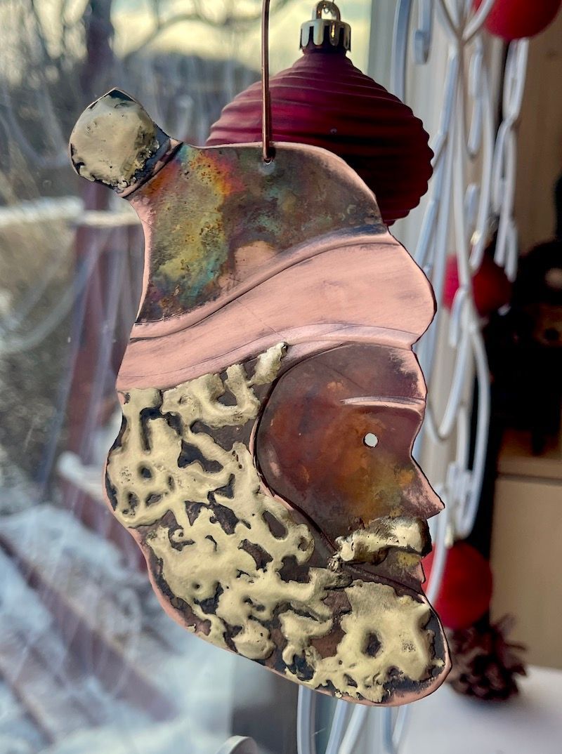 All Copper and Brass Every October I have some fun and make up a few Santa ornaments for the Holiday Season. Signed and dated by Joel Hotchkiss.. A fun, whimsical gift for a friend, on the mantle or the Christmas tree. 6"H X 4"W